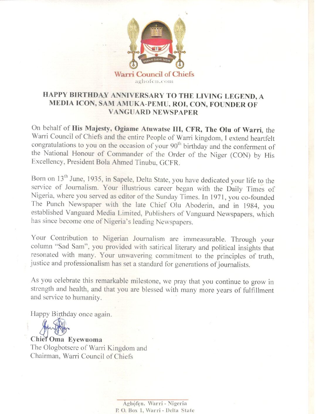 Warri Council Of Chief Celebrate a living legend, a media icon, Sam Amuka-pemu founder of Vanguard Newspaper HAPPY BIRTHDAY ANNIVERSARY…