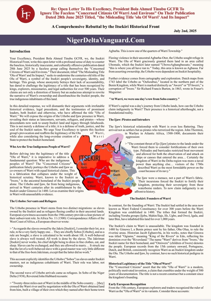 RE: OPEN LETTER TO HIS EXCELLENCY, PRESIDENT BOLA AHMED TINUBU GCFR TO IGNORE THE FACELESS “CONCERNED CITIZENS OF WARRI AND…