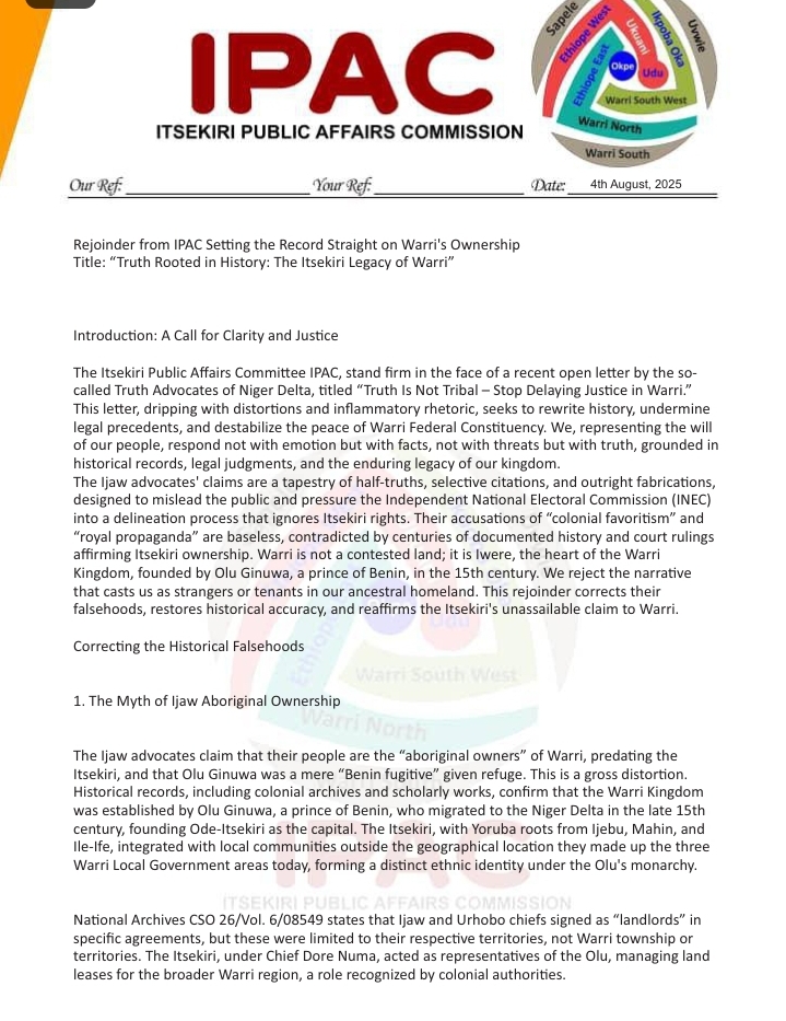 IPAC Rejoinder To Ogbe-Ijoh: Setting the Record Straight on Warri’s Ownership Title: “Truth Rooted in History: The Itsekiri Legacy of…