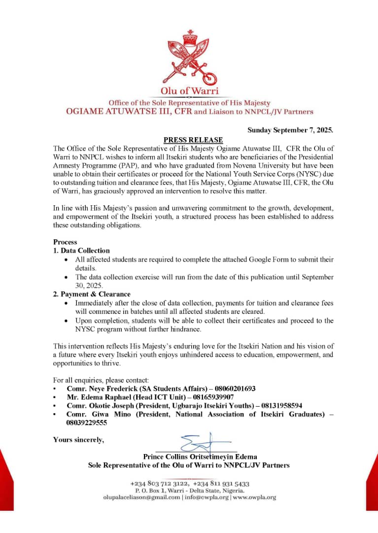 Olu of Warri Moves to Resolve Certificate and NYSC Bottlenecks for Novena University Itsekiri PAP Graduates WARRI, DELTA STATE –…